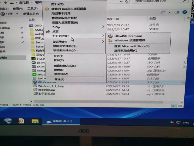 分區(qū)完成后關(guān)掉分區(qū)工具,打開我的電腦找到之前u盤里下載的鏡像,右鍵打開點(diǎn)擊打開方式,選擇windows資源管理器。