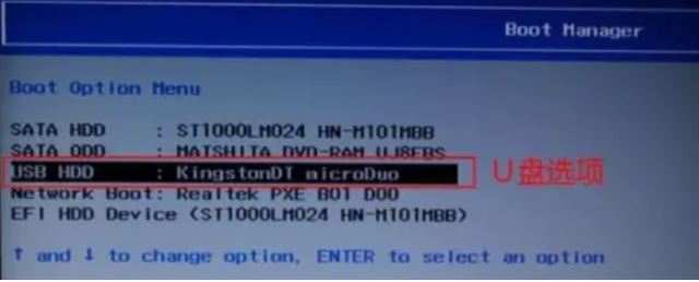 3、在啟動項選擇菜單界面下,選擇usb項,按回車鍵即可進入U盤重裝頁面。